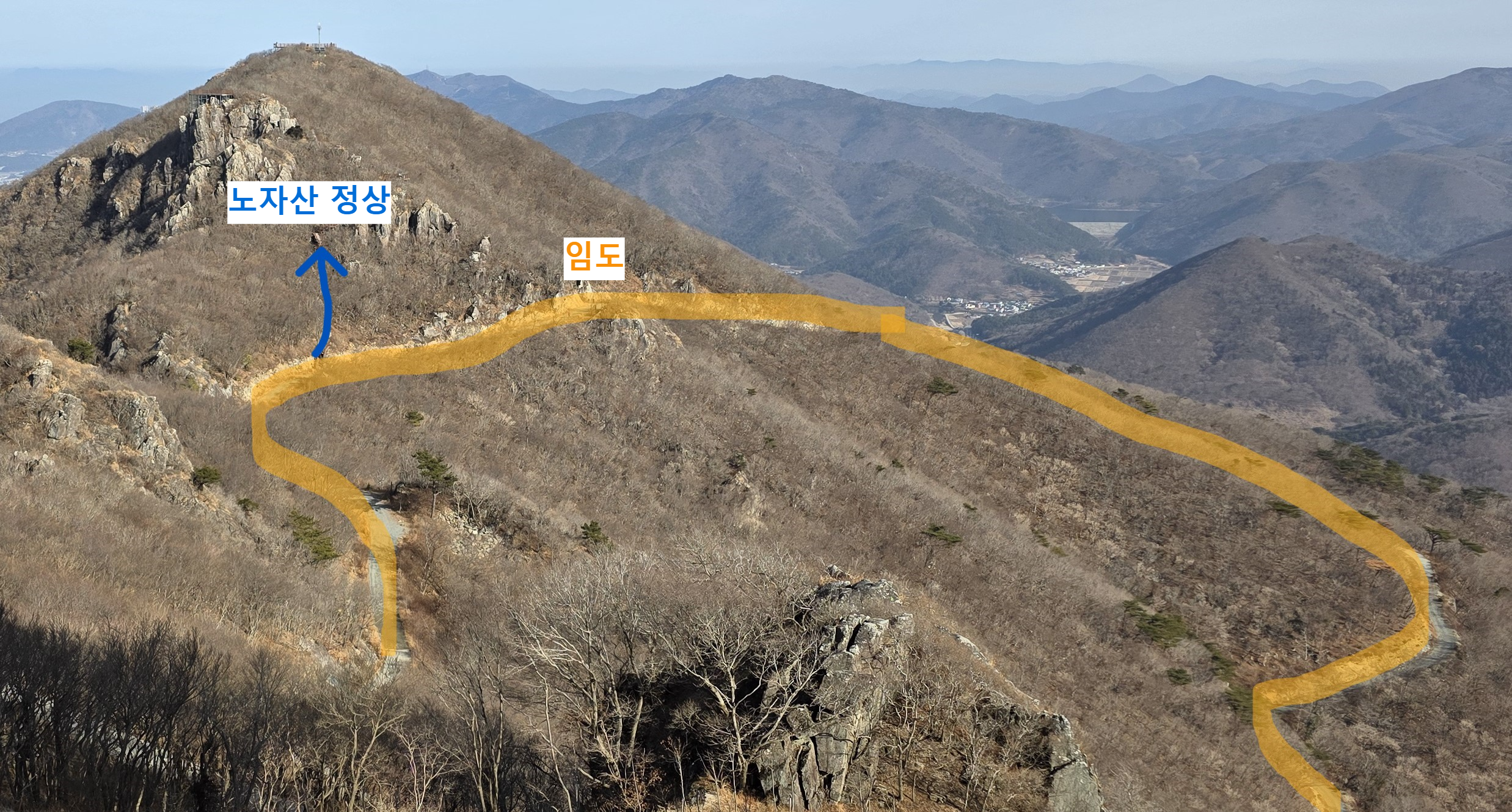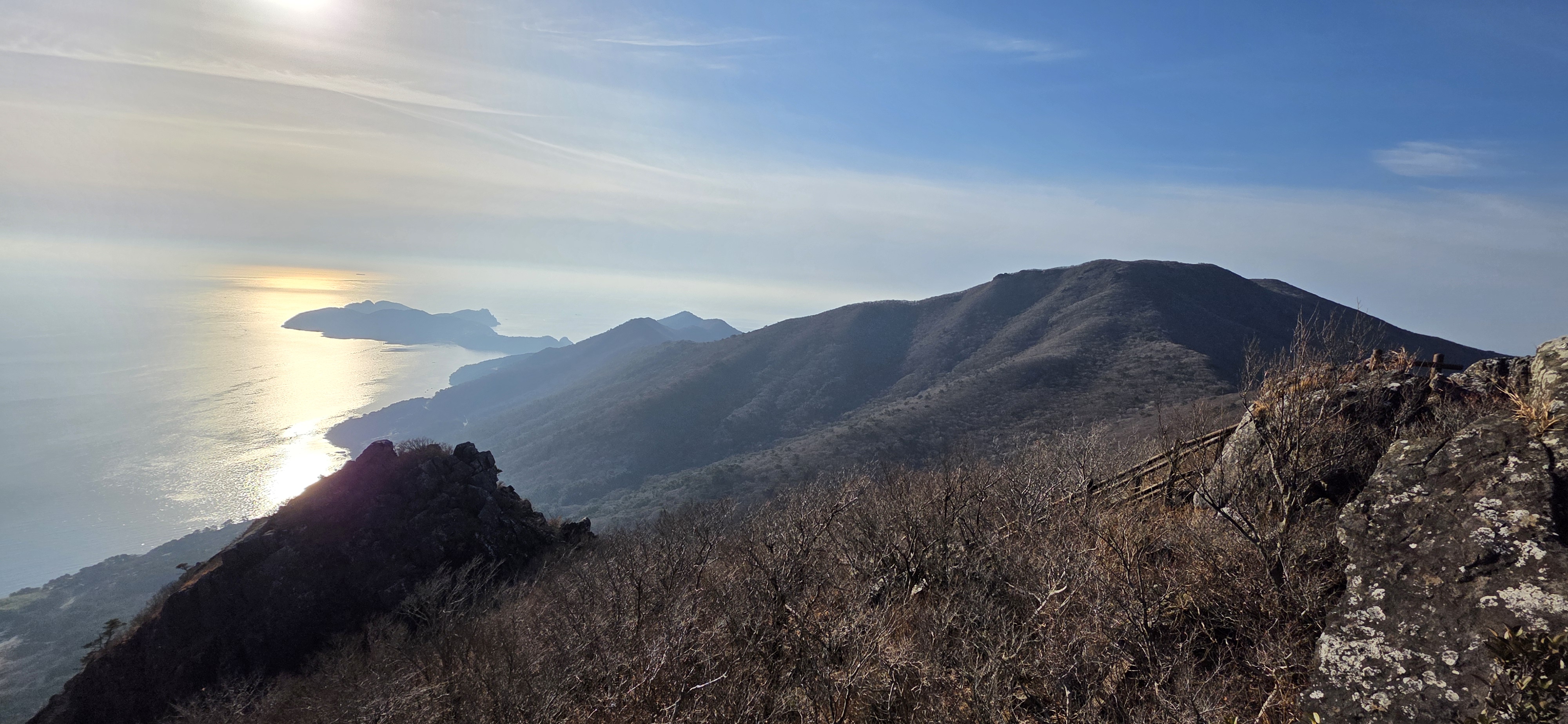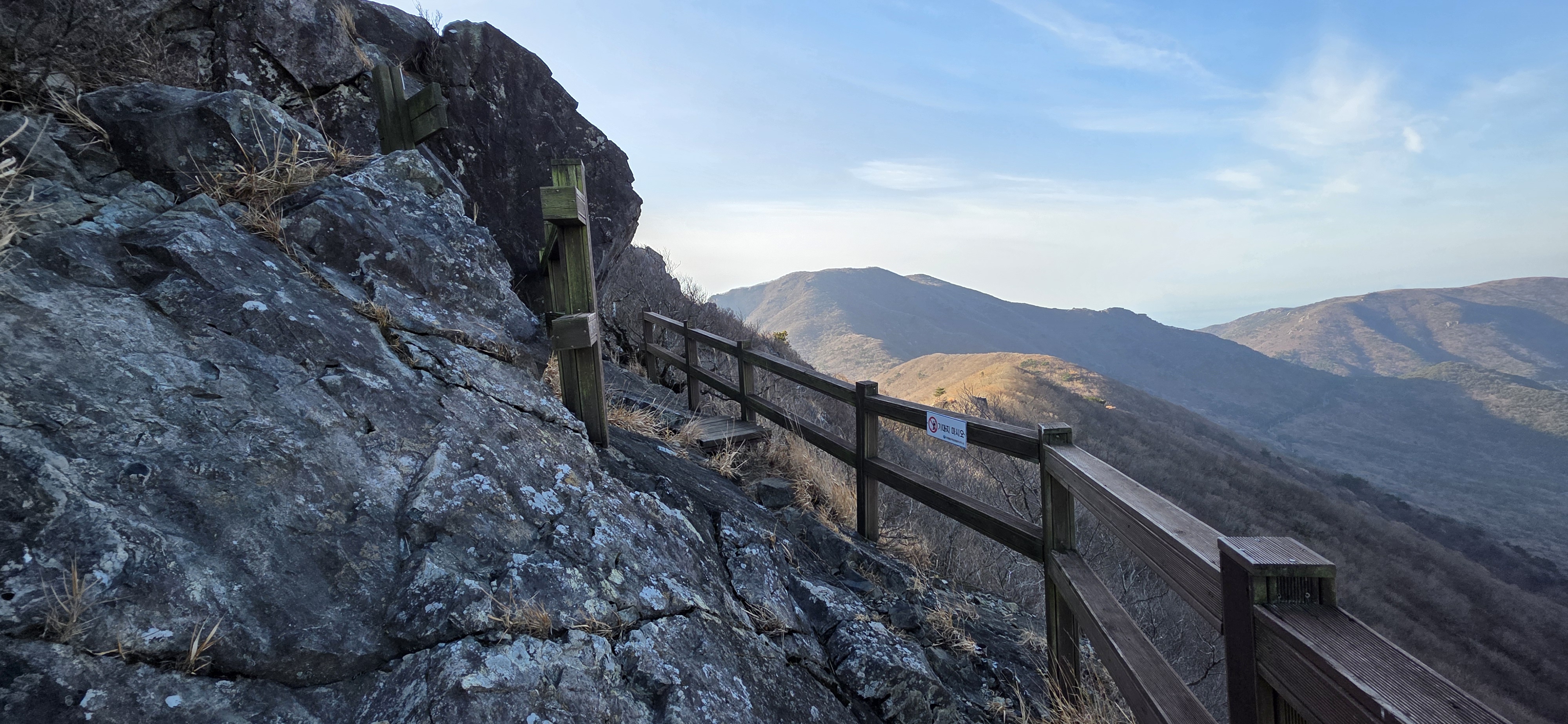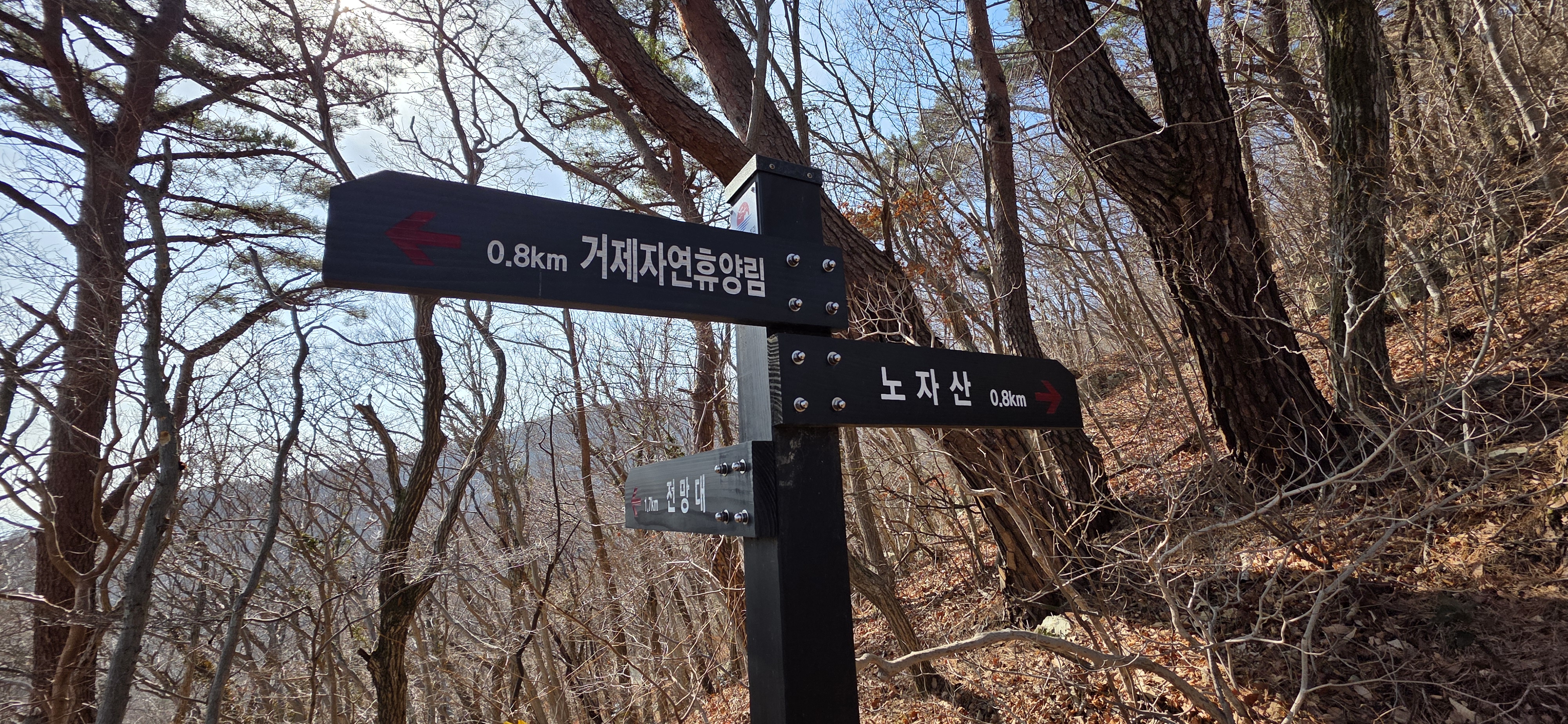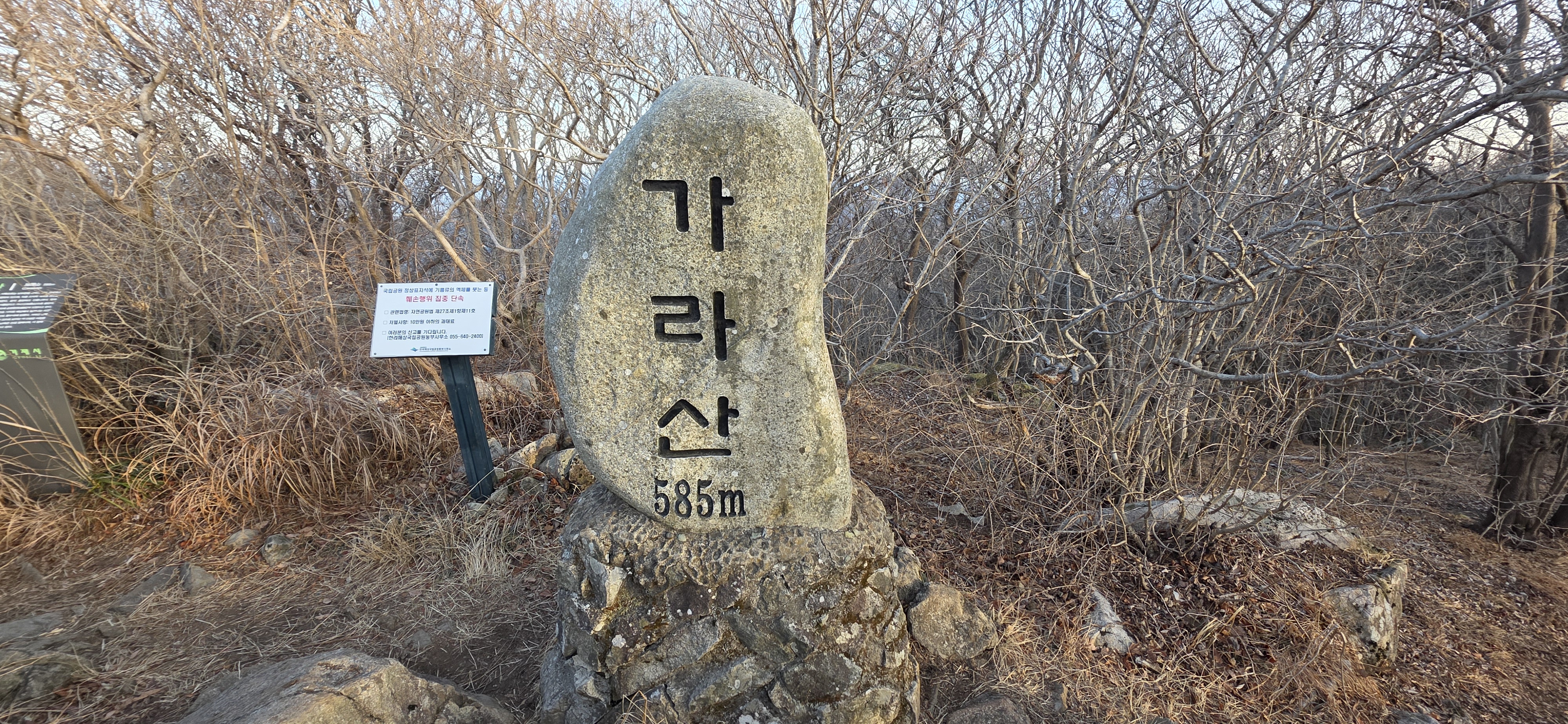 가라산~노자산 능선 구간은 완전한 암석 지대가 아니라서 큰 나무들이 무성하게 많음. (남쪽 지방, 특히 섬 지역의 산들은 거의 이런 것 같음) 그래서 능선길이 생각보다 지루한 부분이 있음.