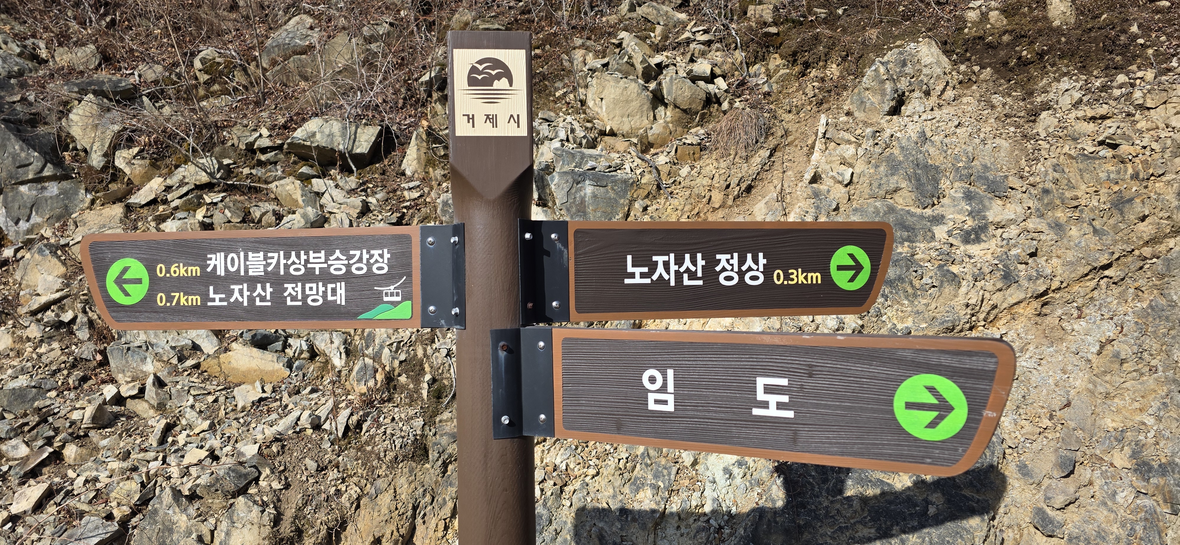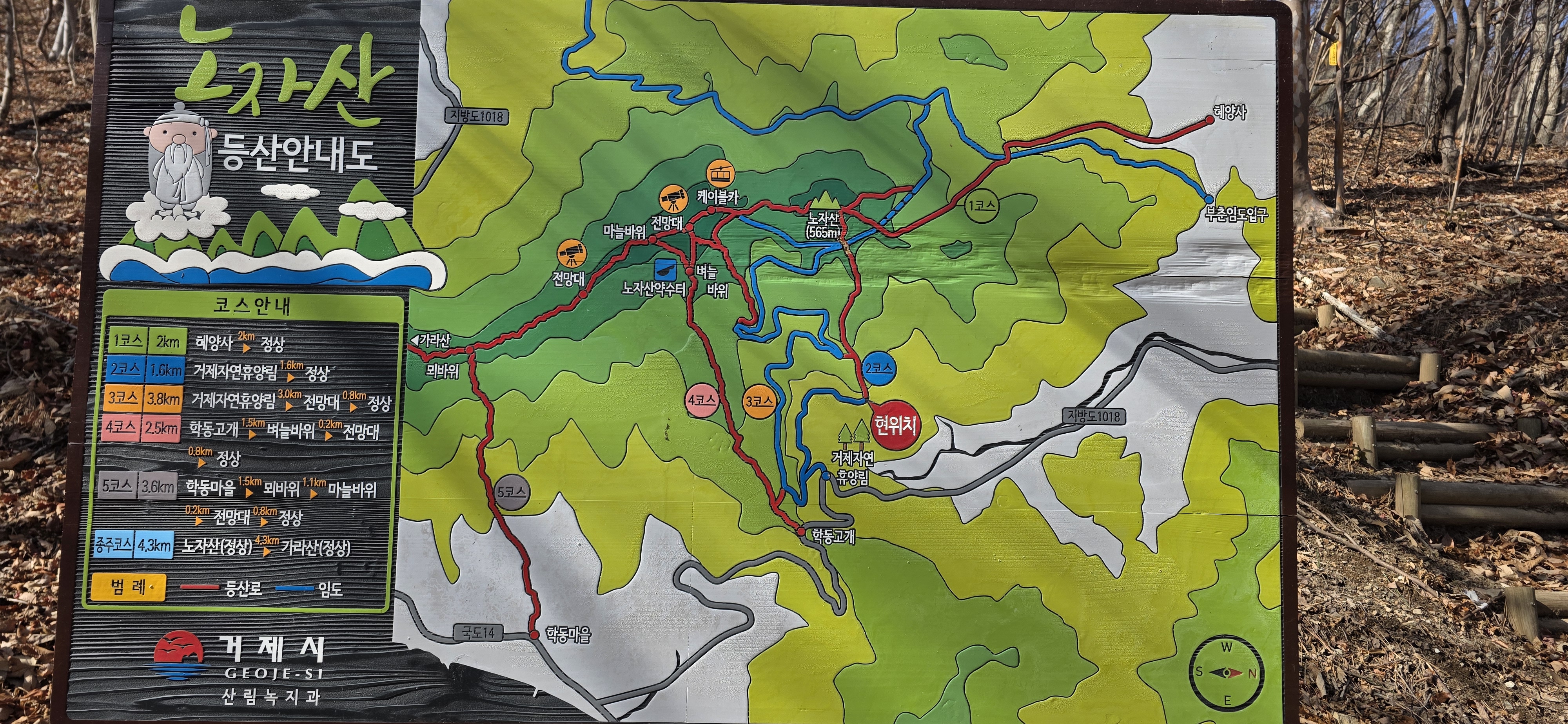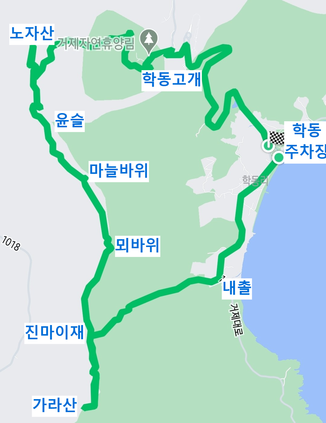 코스 : 학동주차장 - 내촐(등산로 입구) - 진마이재 - 가라산(왕복) - 진마이재 - 뫼바위(전망대) - 마늘바위(전망대) - 케이블카 상부승강장(윤슬전망대) - 노자산 - 노자산 자연휴양림 - 케이블카 하부승강장/학동고개 - 학동저수지 - 학동주차장