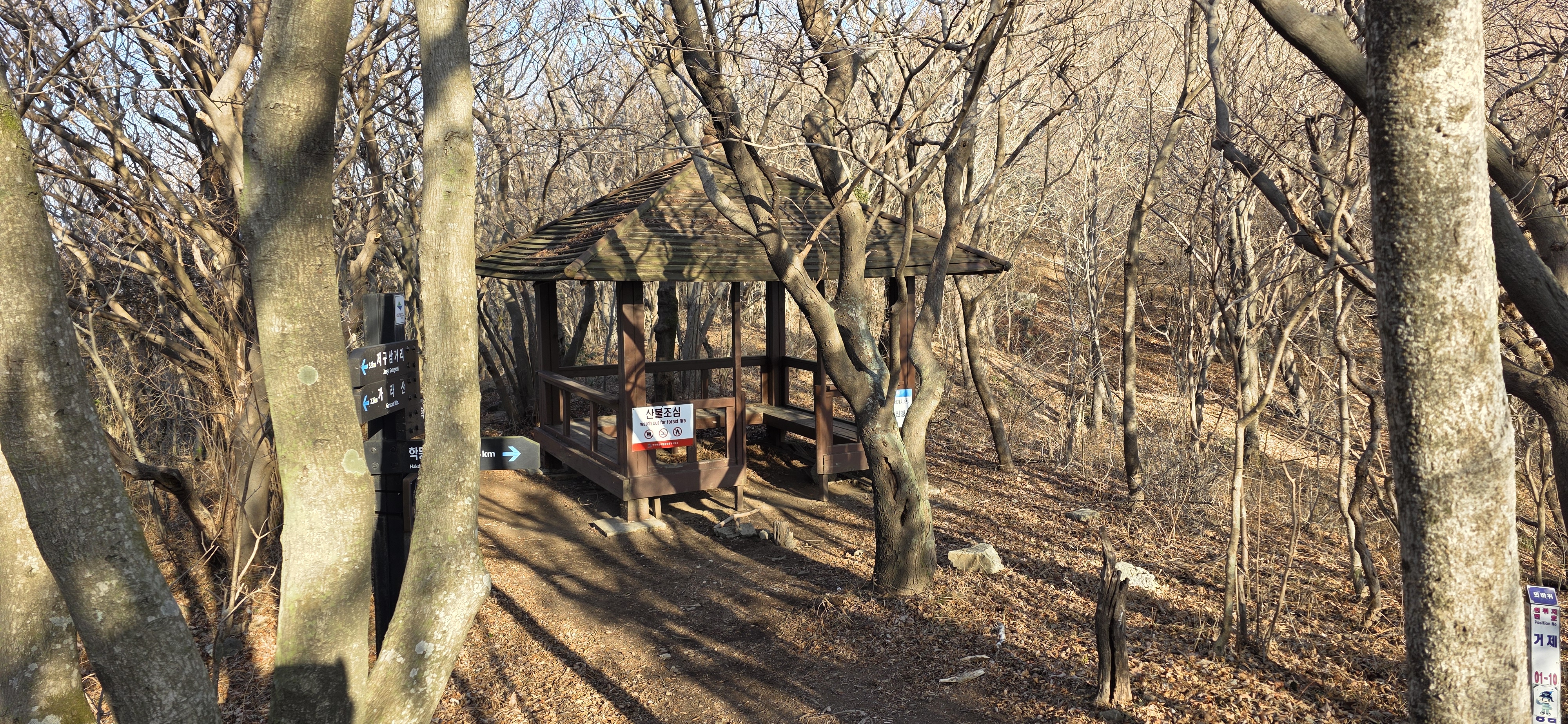 이곳에서 바로 학동고개로 하산할 수도 있고, 노자산에서 자연휴양림으로 하산할 수도 있음.