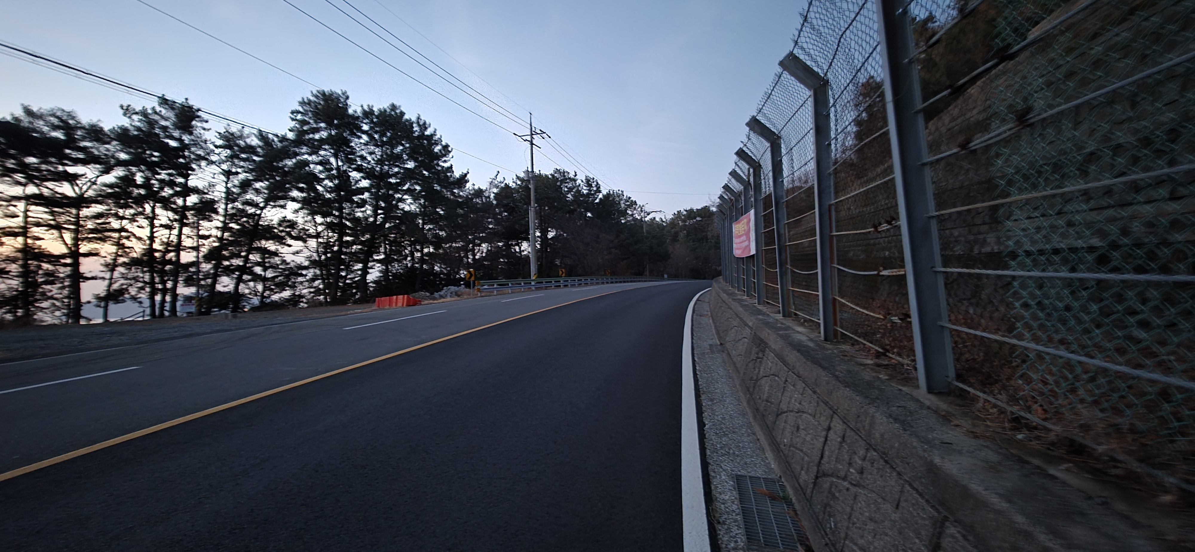 차량과 보행자의 안전을 위해 가드레일/경계석 바깥쪽으로 내려감. 길이 좁아 이마저도 어려운 구간은 어쩔 수 없이 아스팔트 위로 걸어감.