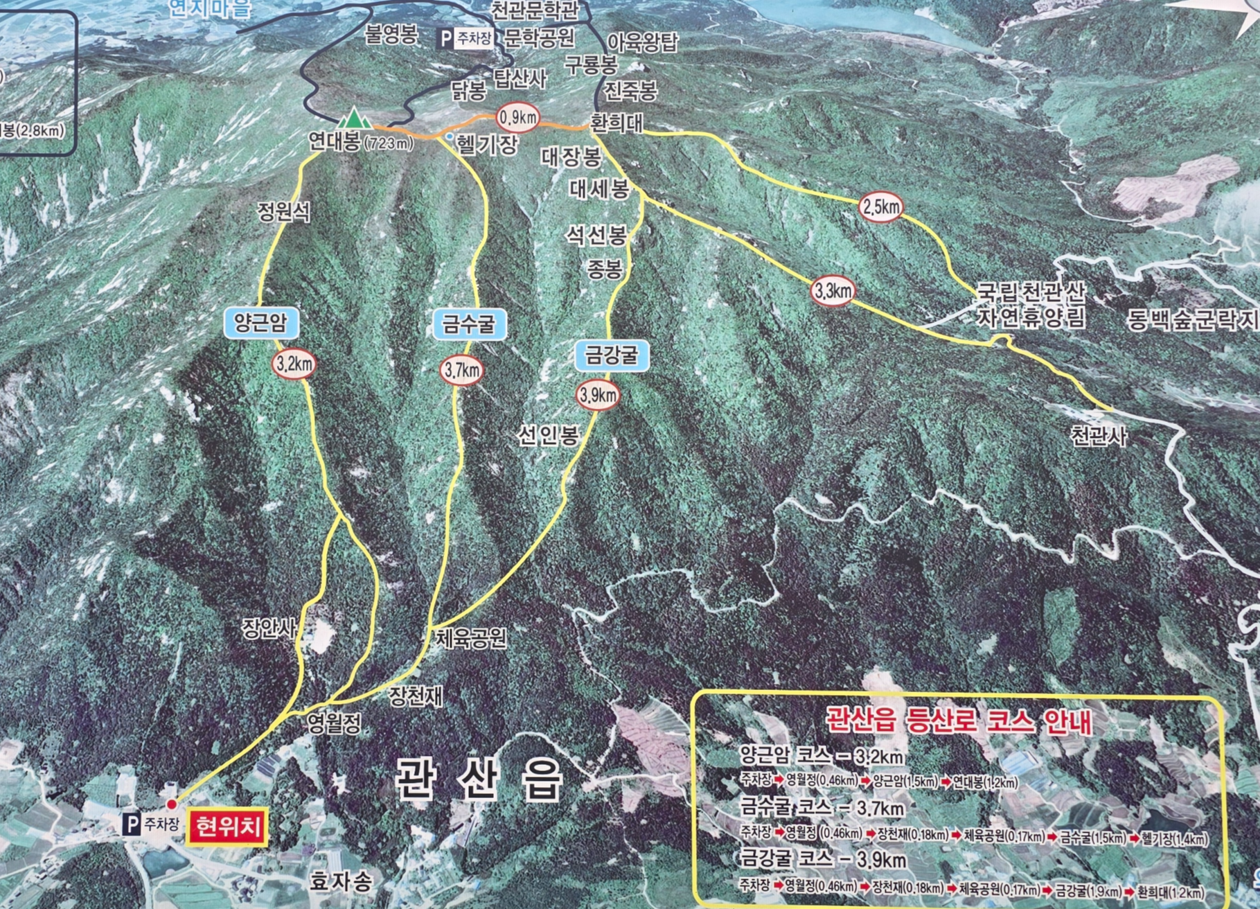 코스(금수굴-양근암 코스) : 주차장 - 1코스 갈림길 - 장천재 - 2/3코스 갈림길(체육공원) - 금수굴 - (억새밭) - 연대봉 - 양근암 - 주차장